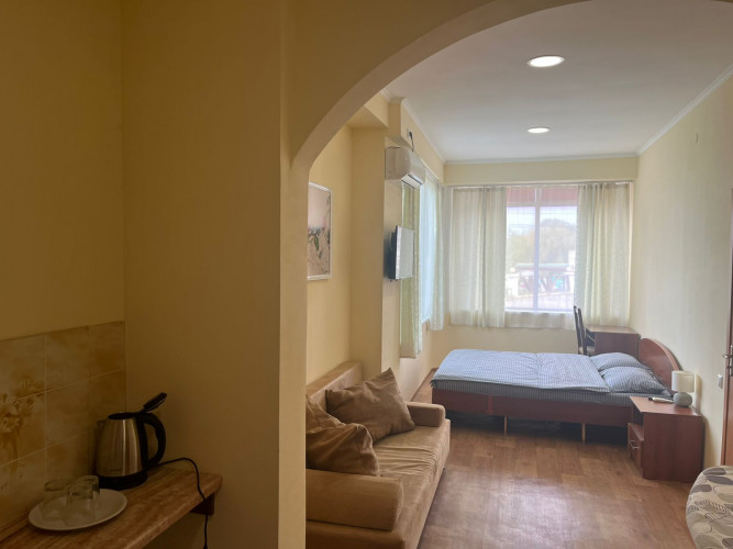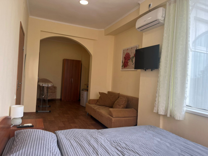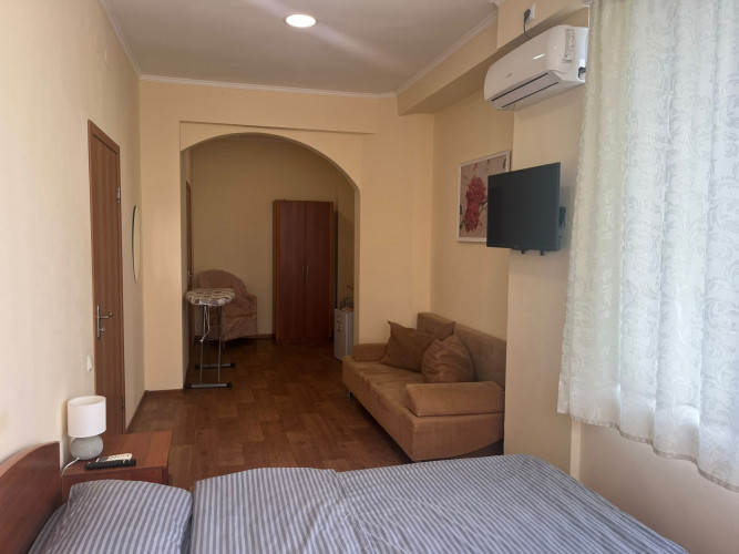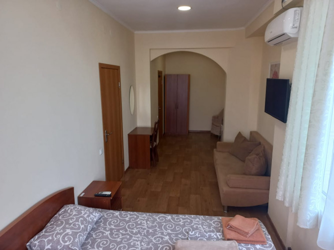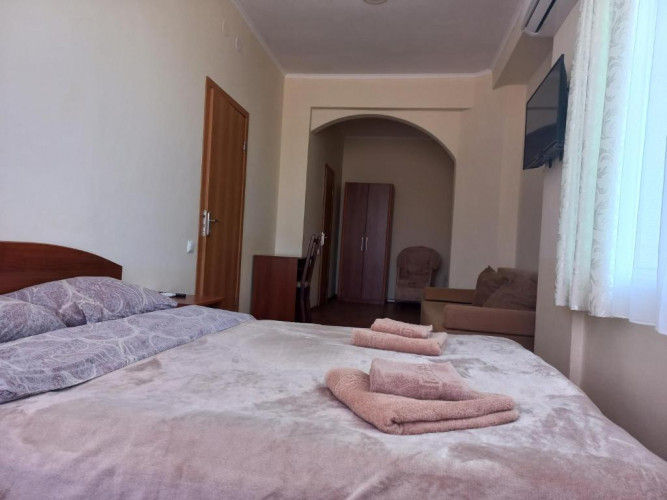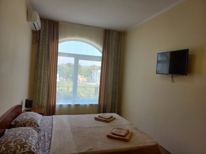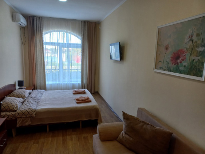 В номерах: одна двуспальная кровать, двуспальный диван, санузел (душевая кабина, умывальник, туалет), холодильник (мини-бар), ТВ (кабельное), чайник, сплит-система, дворик патио, вид на море.